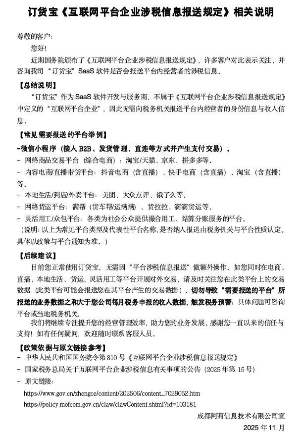 发表时间:2025-11-27 09:33 一、订货宝是否报送了我们公司的业务数据? 订货宝作为软件开发服务商,不属于电商平台,不会向税务部门直接报送任何涉税数据,请 您放心。具体可参考相关说明文档。