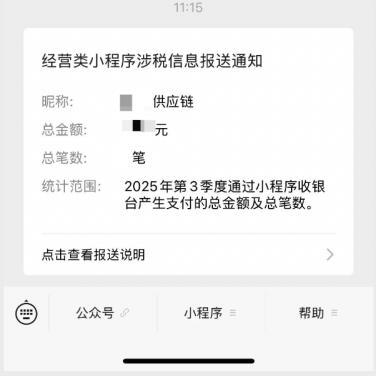 二、我收到了小程序发送的涉税信息报送通知,这是什么?我该怎么办? 这是小程序平台根据相关规定,将您企业在小程序内的在线交易数据报送至税务部门后 发出的告知通知。 由于一个企业可能注册多个小程序,请您提供收到的报送通知页面截图(示例如下), 以便我们协助核实: