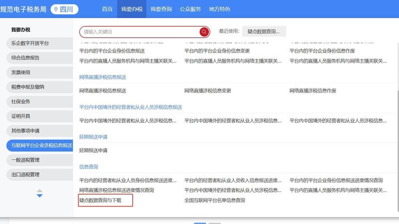 1. 请先自查税务申报数据是否正确,如确认无误,可及时向当地税务专管员说明情况并报备 排查是否使用过其他需报送数据的平台。 财务人员可登录电子税务局,在“互联网平台涉税信息报送—疑点数据下载与查询”中 查看相关数据,如下图。