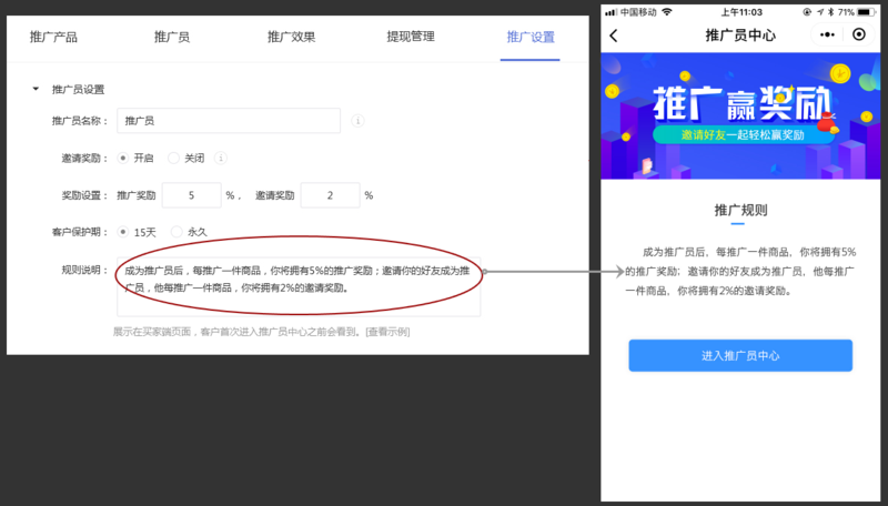 a-4.规则说明:可自定义推广员的推广规则,规则将会展示在买家端页面,当客户首次进入推广员中心之前会看到。