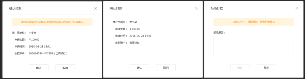 ⑥点击“提现管理”标签项,您可在此处对推广员的提现申请进行操作。当提现方式为“商家手动结算”的结算方式时,商家需另外转账再到这里进行确认操作;当提现方式为“系统自动结算”的结算方式时,商家只需在这里点击“确认”,系统自动打款至对应的支付宝或微信零钱账户中。