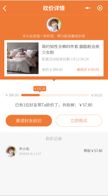 ②需砍次数的峰值为99,即包含买家自己在内,可砍99刀 ③商品底价不能超过商品的商城价,且对商品的所有购物选项都适用(若底价设置为0,则其所有的购物选项砍价底价均为0) ④一个活动支持添加多个活动商品