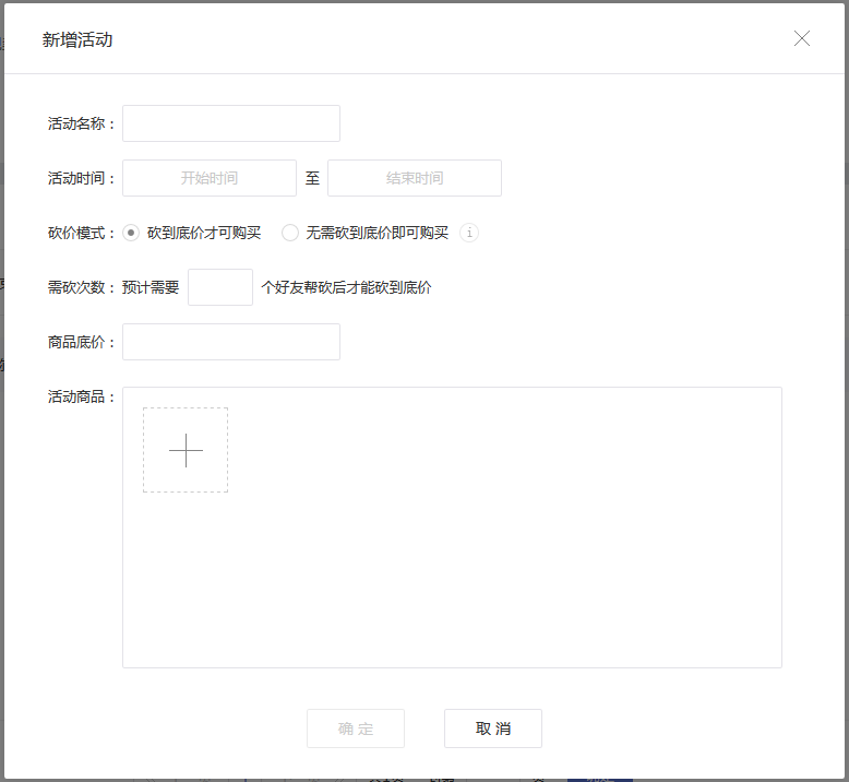 (2)新增或编辑砍价活动 ①砍价模式分为两种:砍到底价才可购买、无需砍到底价即可购买(如果该砍价活动的底价为8元,原价为88元,买家砍到68元时可选择直接购买或者继续砍价,直接购买的话是以砍到的当前价(68元)进行购买) 直观的体现就是在砍价详情页中,当未砍到底价时,如果选择的是“砍到底价才可购买”的模式,那么页面中的购买按钮不会出现,如果选择的是“无需砍到底价即可购买”,那么页面中会同时出现邀请好友砍价和购买按钮