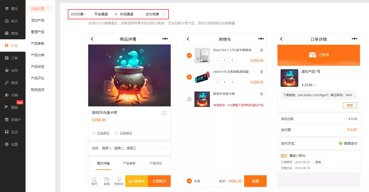 6. 关于iOS付费的特殊说明 卡密产品交易属于虚拟支付,而微信小程序iOS端不支持虚拟支付。(注:以下说明只针对iOS端,安卓端可正常使用。) 因此,关于iOS付费,有以下3种选择: ①关闭通道:关闭iOS付费通道后,买家使用苹果手机访问小程序,无法加购卡密产品,相关价格信息也会被隐藏。 ②改为免费:iOS端所有卡密产品价格为0,买家使用苹果手机访问小程序,可免费购买卡密产品。 ③开启通道:买家使用苹果手机访问小程序,可正常购买卡密产品。但这样有封禁风险,建议谨慎开启。若一定要开启,建议商城小程序审核通过后再选择开启。 注:点击链接了解“关于ios端虚拟支付的完整版微信规范”:https://developers.weixin.qq.com/community/operate/detail/1006